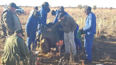 Sawing the horn off a rhino in Africa so poachers won't kill it for the horn's value.